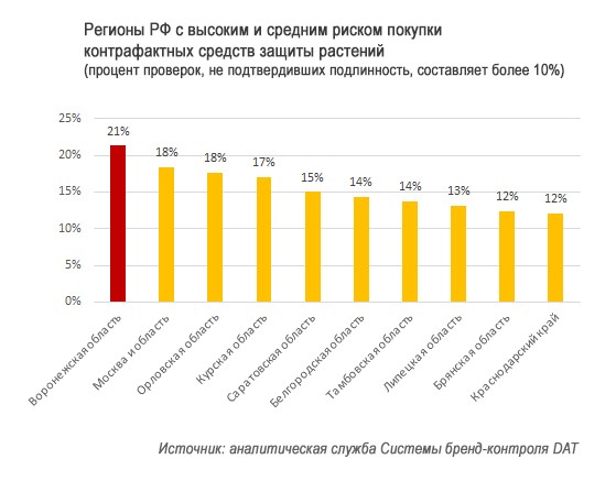 Компания «Авента-Инфо» выяснила, в каких регионах чаще всего встречаются подделки при покупке средств защиты растений. Самой неблагополучной оказалась Воронежская область, где процент покупок, не подтвердивших подлинность, составляет 21%. Данные получены с помощью системы бренд-контроля DAT, которая предоставляет защиту от контрафакта благодаря технологии маркировки продукции специальными метками.