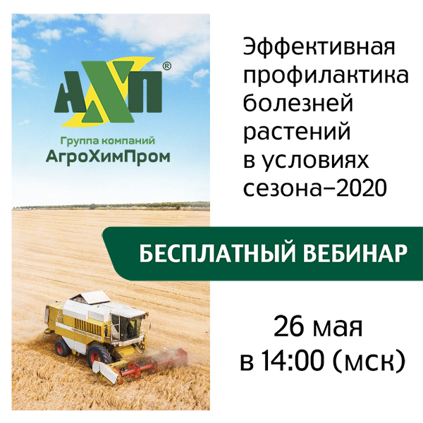 26 мая в 14.00 (по МСК UTC +3) в онлайн режиме состоится вебинар «Эффективные методы профилактики болезней сельскохозяйственных культур с учетом особенностей сезона-2020».