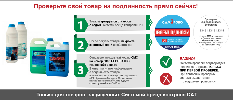 Однако уже существуют производители дезсредств, которые усилили защиту от подделки продукции. Каждая защищенная канистра или флакон с дезсредством имеет маркировку DAT-кодом. Сотрудник школы или детского сада, ответственный за закупку дезсредств, может легко и бесплатно проверить подлинность товара. Для проверки достаточно «пробить» DAT-код по компьютеру или по телефону. Ответ сервиса Системы DAT приходит мгновенно.