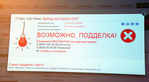 Но при этом бороться с подделками нужно. Значит необходимо предложить такой механизм который бы дал возможность в случае сомнения в качестве продукта быстро проверить его подлинность. Несомненно, что способ проверки подлинности должен быть внешний, так как иной будет скопирован.