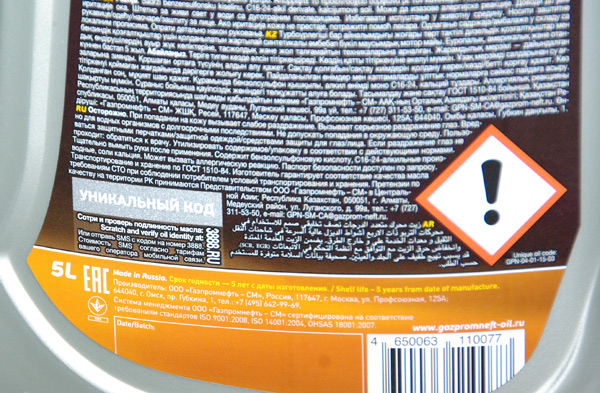 Компания «Газпромнефть - смазочные материалы» остановила свой выбор на введении уникальных кодов каждой канистры объемом 4-5 литров. Для того чтобы получить это код защиты от подделки необходимо стереть защитный слой под которым он находится. А для проверки отправить СМС с ним на короткий номер, приведенный на этикетке.